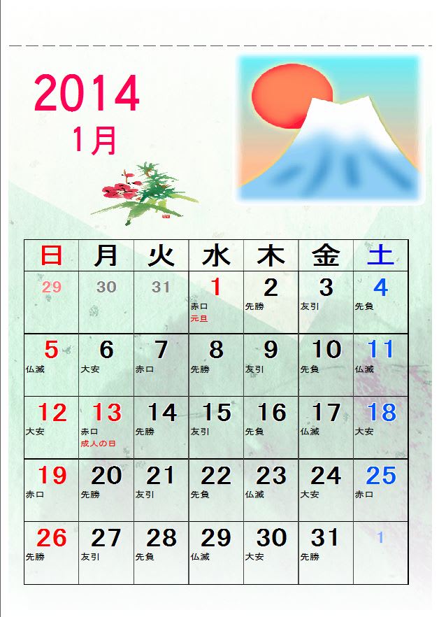 平成26年 2014年 お日柄カレンダー 大安 友引 先勝 先負